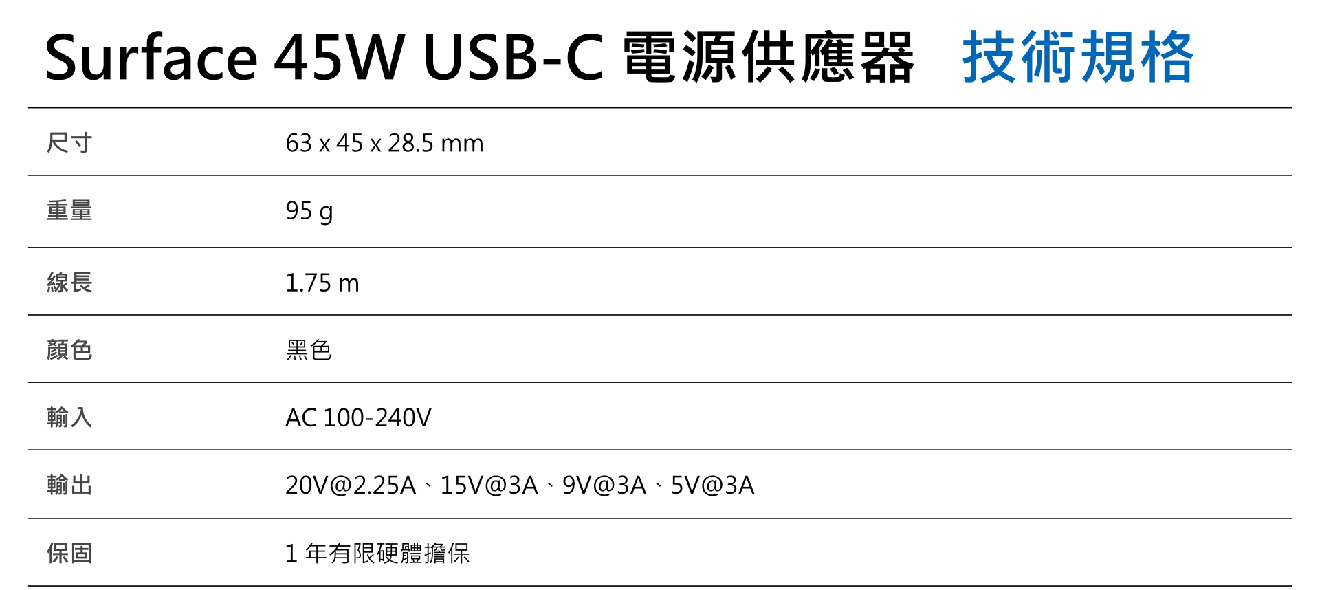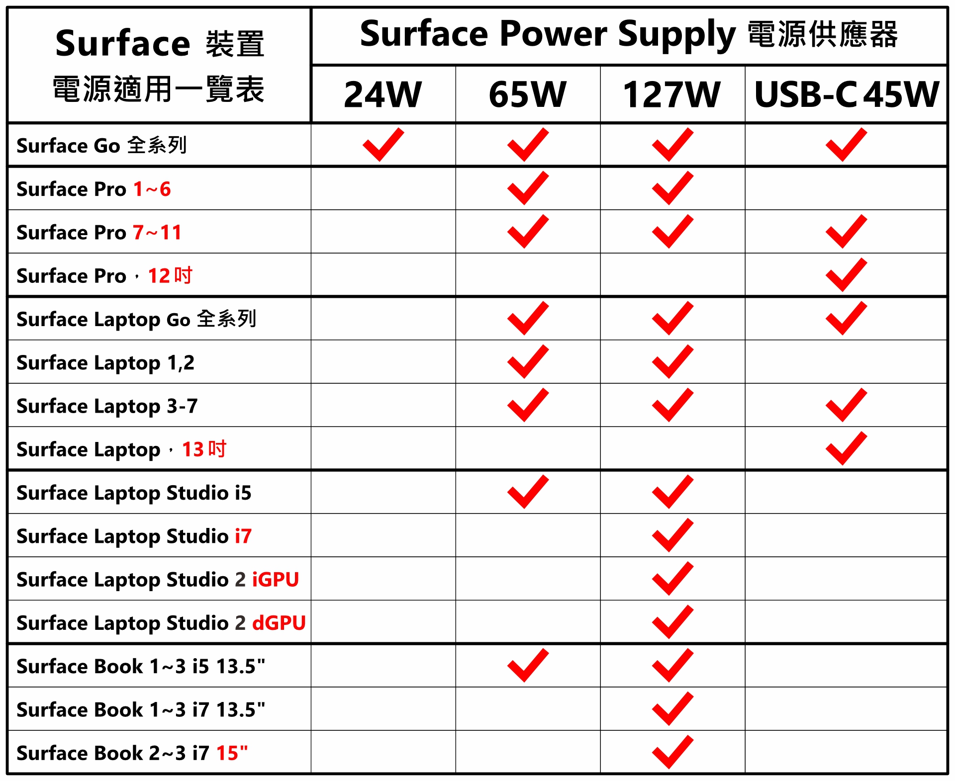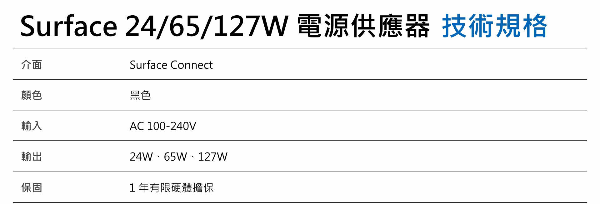 Surface 電源供應器 65W, 127W, 24W, USB-C 45W